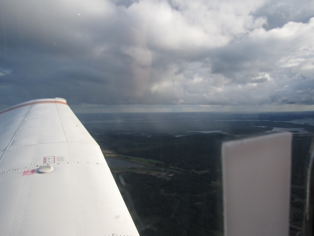 När jag passerat LNA visar det sig att det tornat upp lite regn kring Stockholmsområdet. Mot Stäksön når även regnet fram till mig, först bara lite lösa droppar. Blev lite osäker på om det var något extra att tänka på när det regnade så fuskade och roppade upp Kicki, bromsa inte efter landning och var försiktig med sidrodret på marken vart svaret. Vet inte om det är så att man inte får bromsa alls eller om man bara ska ta det lugnt tills hjulen fått grepp. Jag har i alla fall inget minne av att man inte får använda bromsar på våt bana, men att man ska se till att dom inte är till vid sättning… ska försöka komma ihåg att kolla det lite mer noga någon gång.